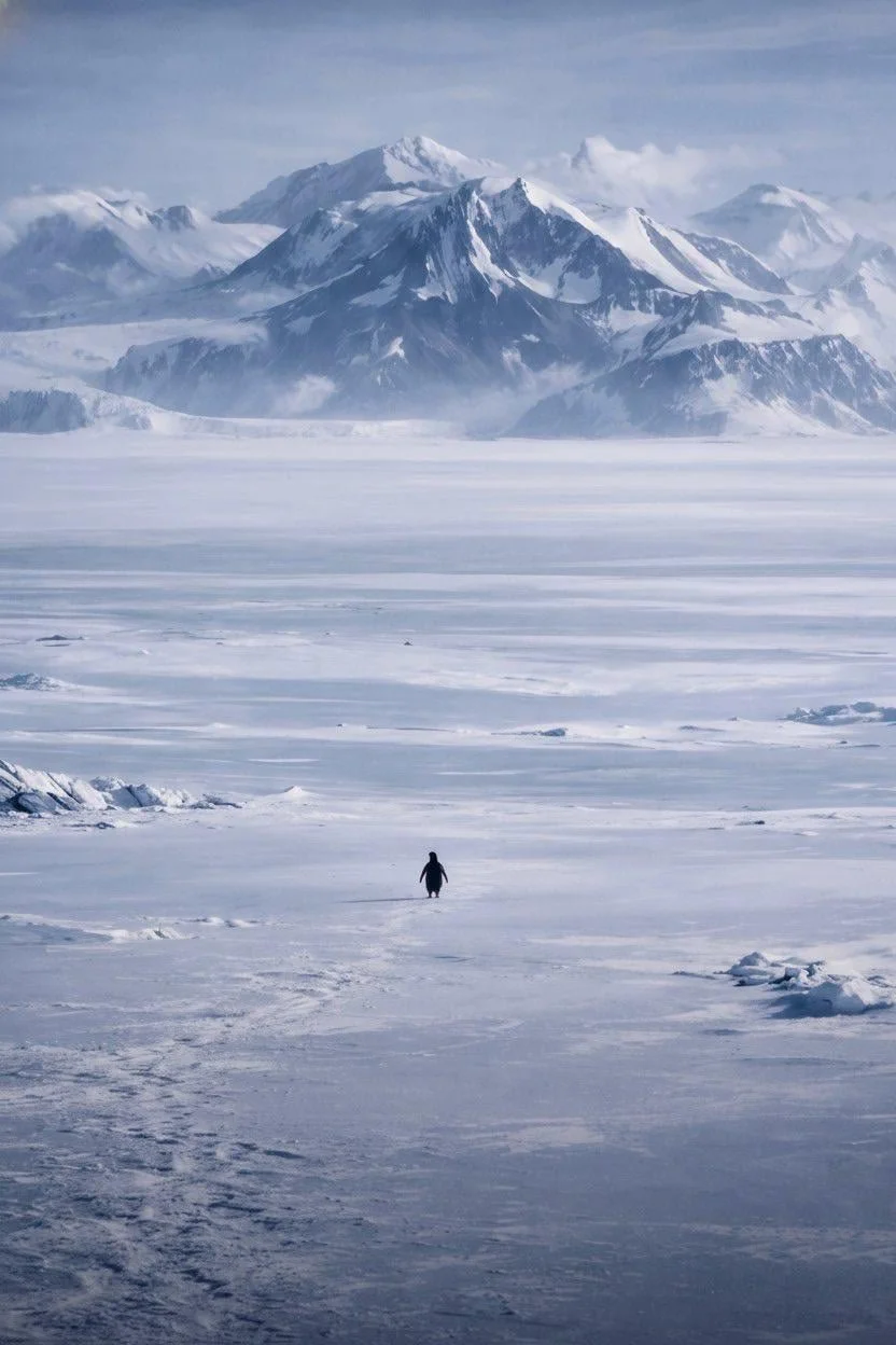 El pingüino camina hacía un espacio sin promesas. No hay testigos, no hay recompensa asegurada.